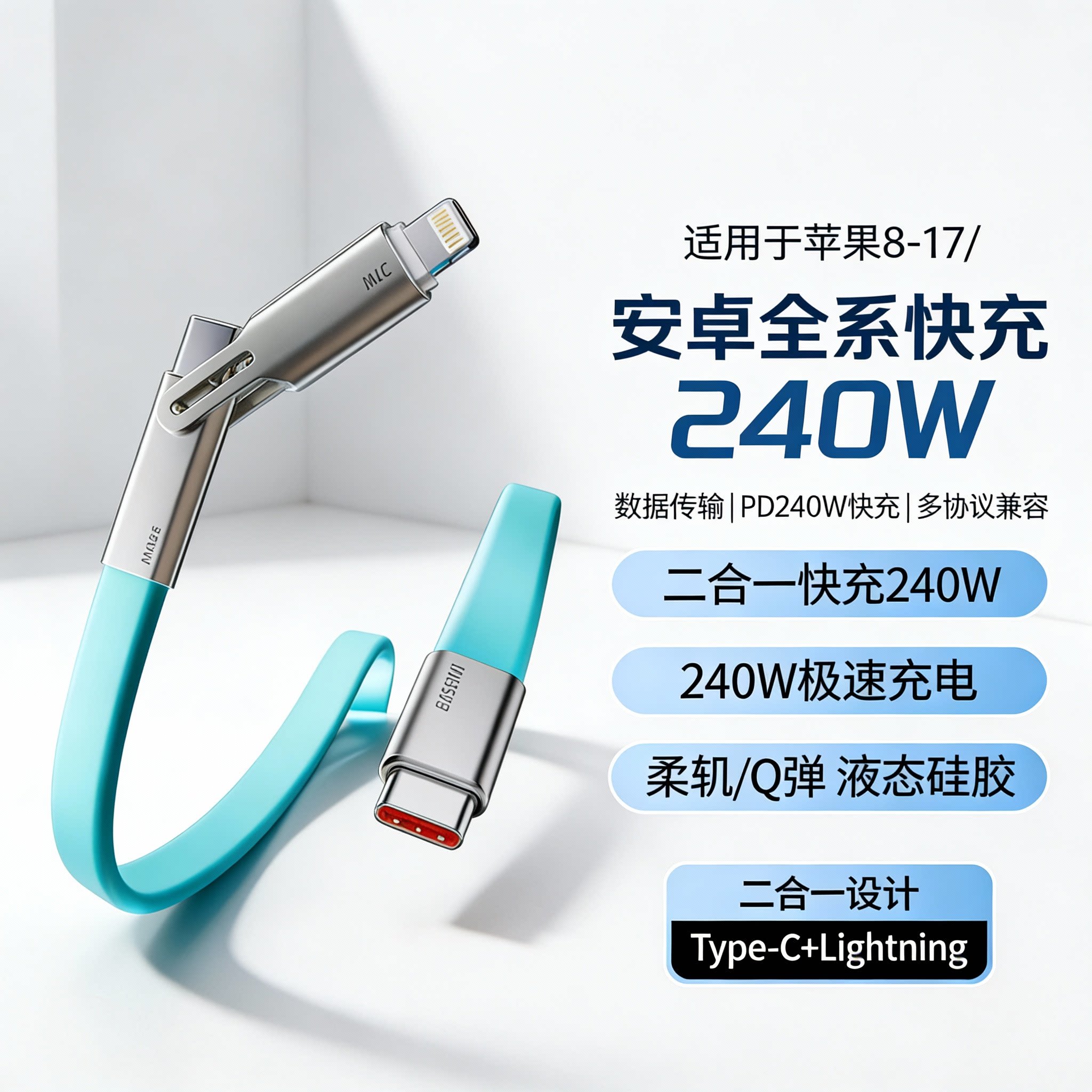 【超级闪充】倍魔240W二合一软硅胶扁线双头快充数据线Type-C+Lightning一拖二手机线适用于苹果安卓充电线