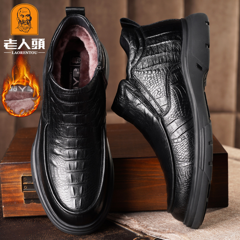 老人头棉鞋男鳄鱼纹皮鞋羊毛保暖冬季时尚高帮鞋加绒真皮商务男鞋
