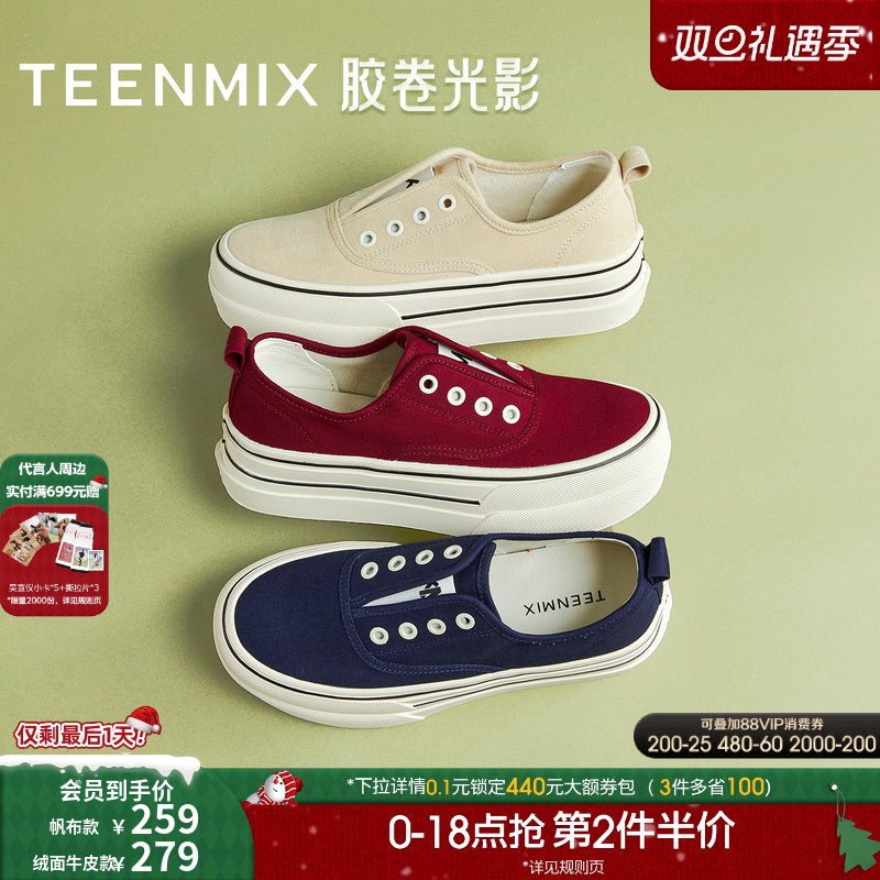 天美意胶卷光影厚底一脚蹬红色帆布鞋运动板鞋女休闲鞋2025秋新款