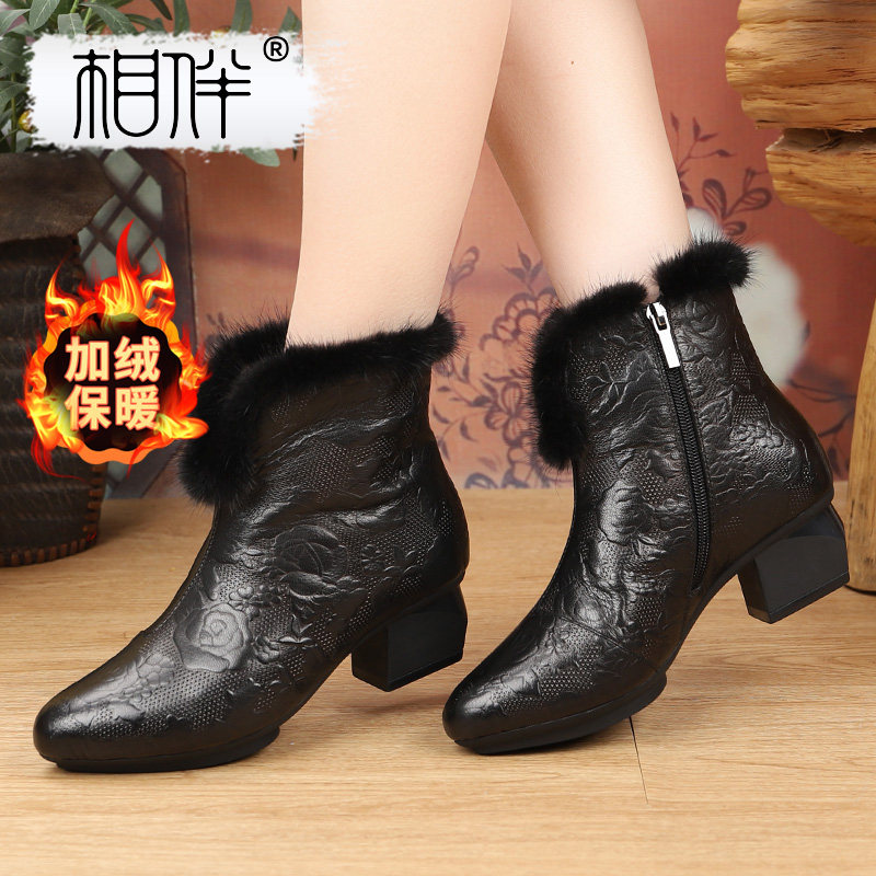 相伴加绒真皮短靴女冬季妈妈皮靴羊皮新款貂毛复古显脚小尖头棉鞋