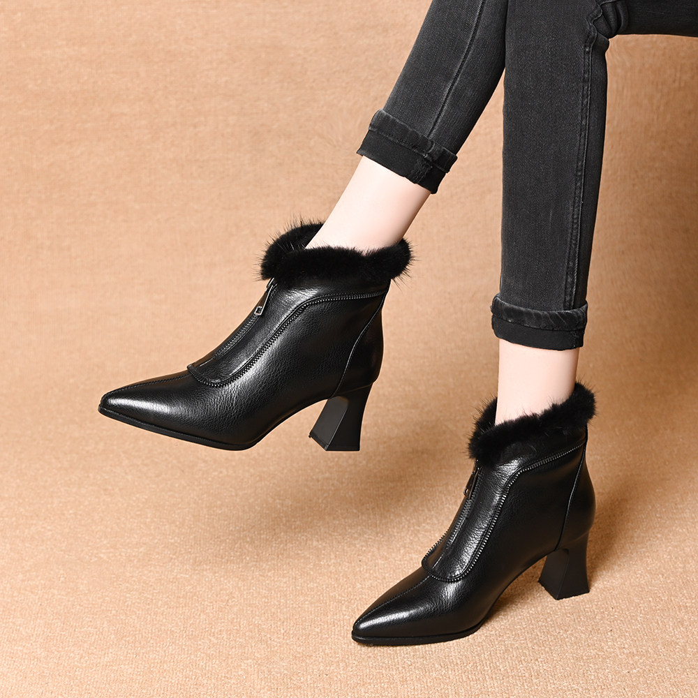 2025新款冬季水貂毛高跟短靴女粗跟磨砂真皮鞋加绒棉鞋羊皮女靴子