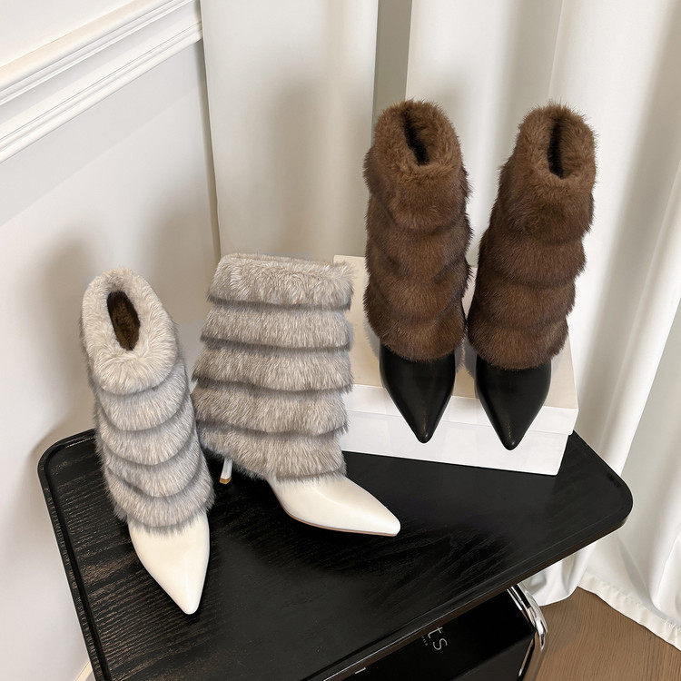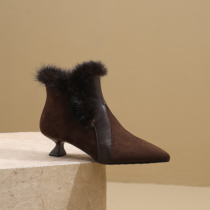 短靴女2023年秋冬新款水貂毛细高跟鞋尖头真皮磨砂时装靴女鞋加绒