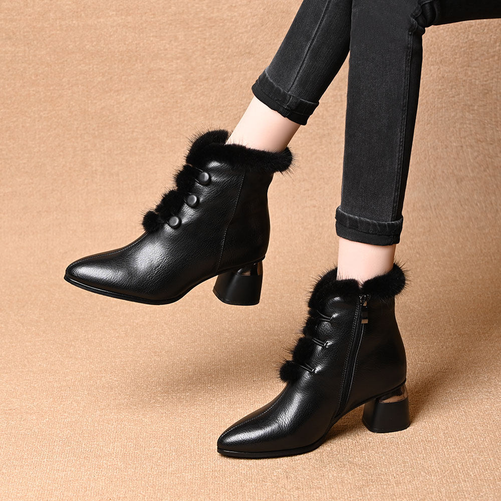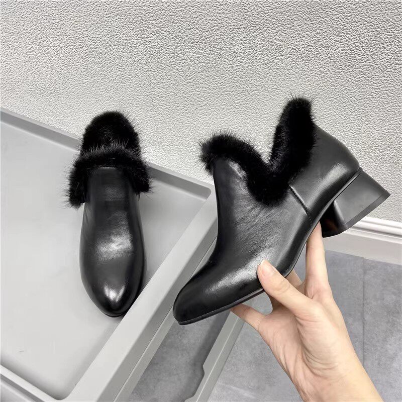 2025新款秋冬季女鞋气质水貂毛短靴粗跟高跟真皮鞋中跟加绒女靴子