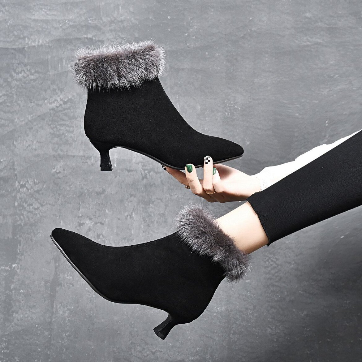 AMEINOR冬季新款拼接貂毛短靴尖头中跟细跟真羊皮加绒保暖女靴子