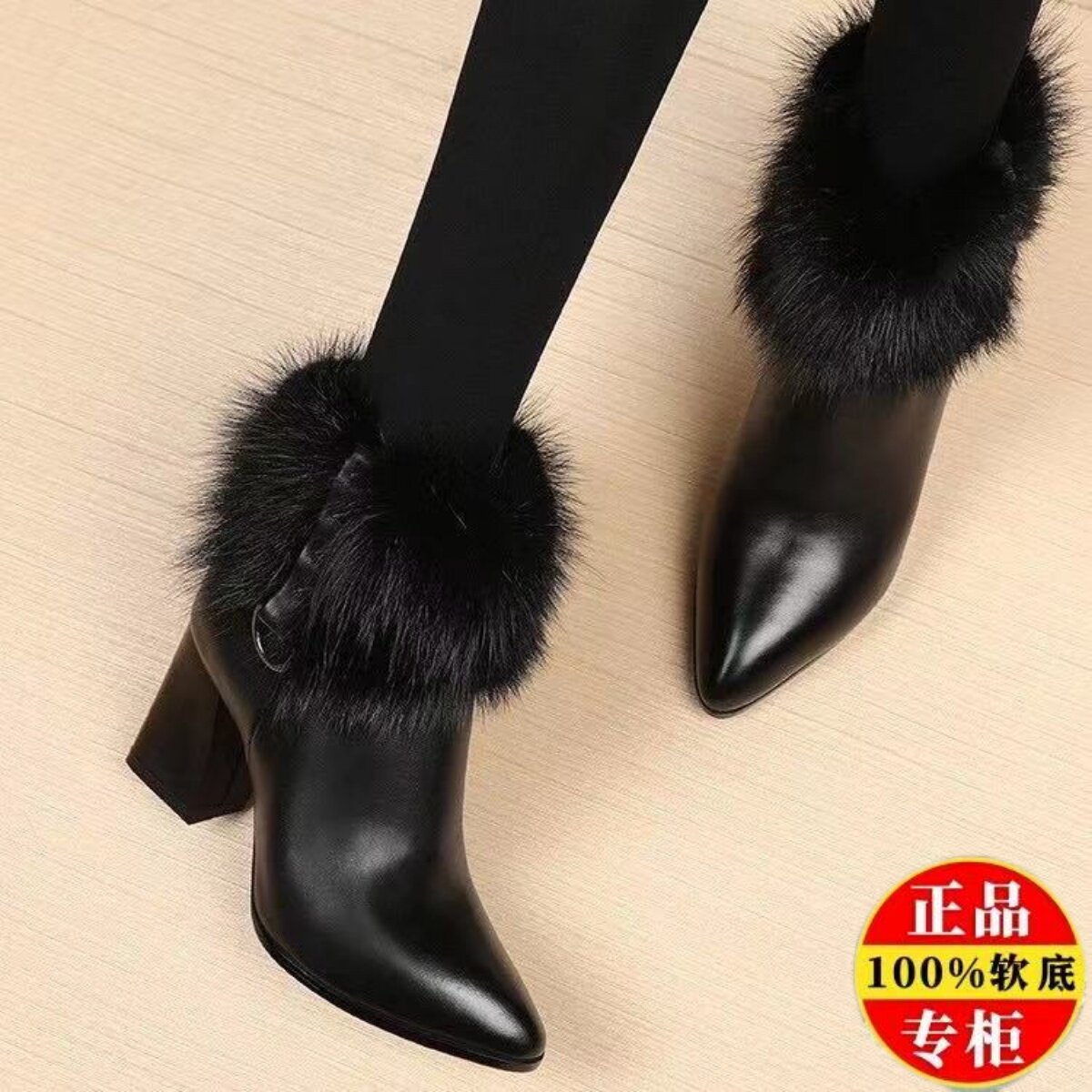 品牌断码高跟短靴2025秋冬新款真皮粗跟尖头貂毛加绒毛毛靴马丁靴