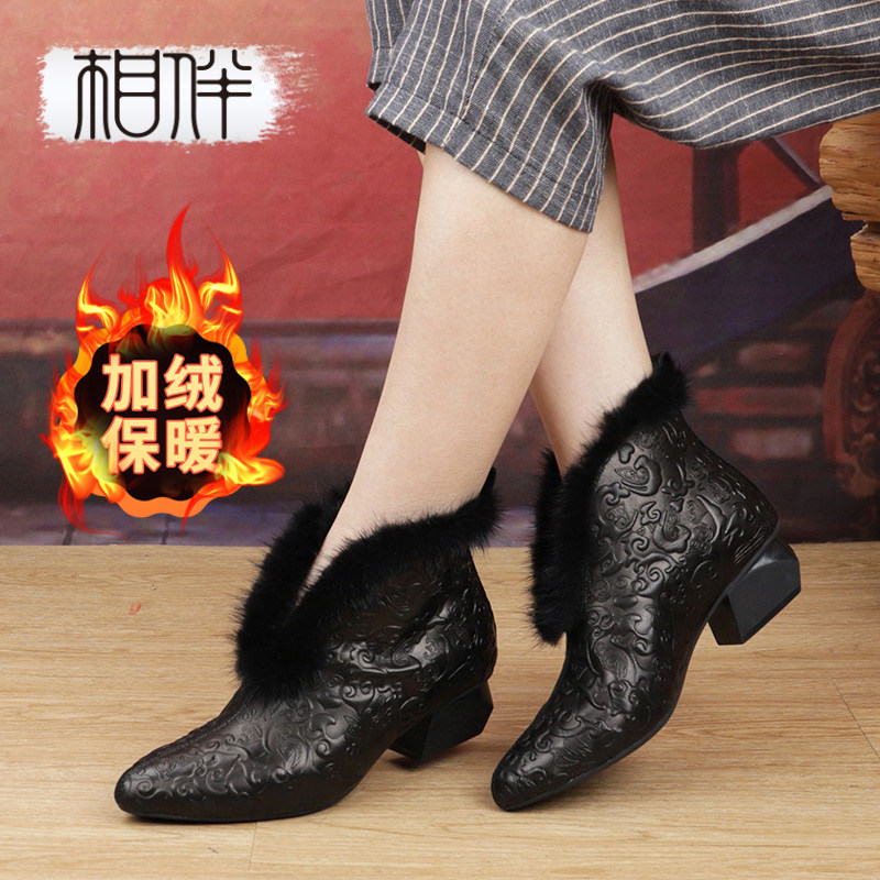 冬季新款民国风小牛皮水貂毛女士真皮短靴绣花粗跟高跟配旗袍鞋子