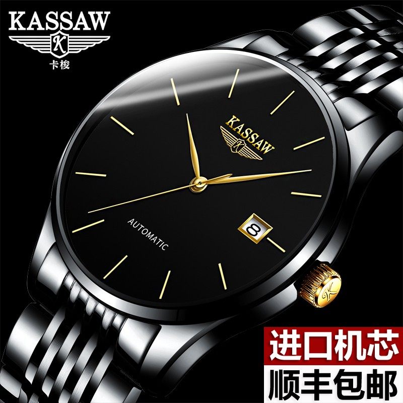 超薄手表品牌机械表简约全自动进口卡俊精钢俊表防水瑞士男性全黑