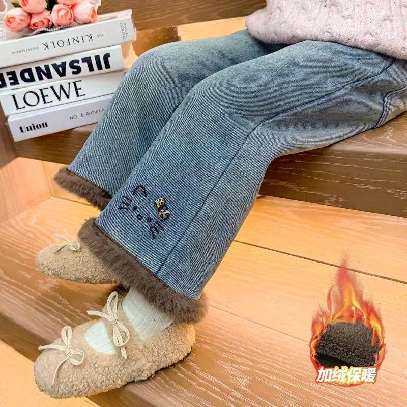 女童冬季加绒牛仔裤2025新款小女孩卡通刺绣裤子中大童加厚阔腿裤