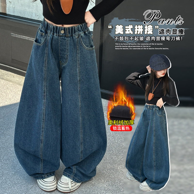 女童冬季加绒牛仔裤2025新款儿童休闲长裤女大童秋冬加厚阔腿裤子