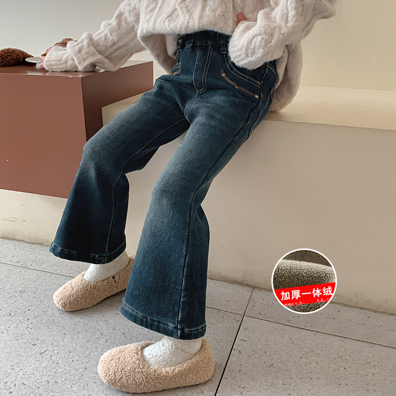 女童冬季加绒牛仔裤秋冬2024新款儿童一体绒裤子小女孩洋气喇叭裤
