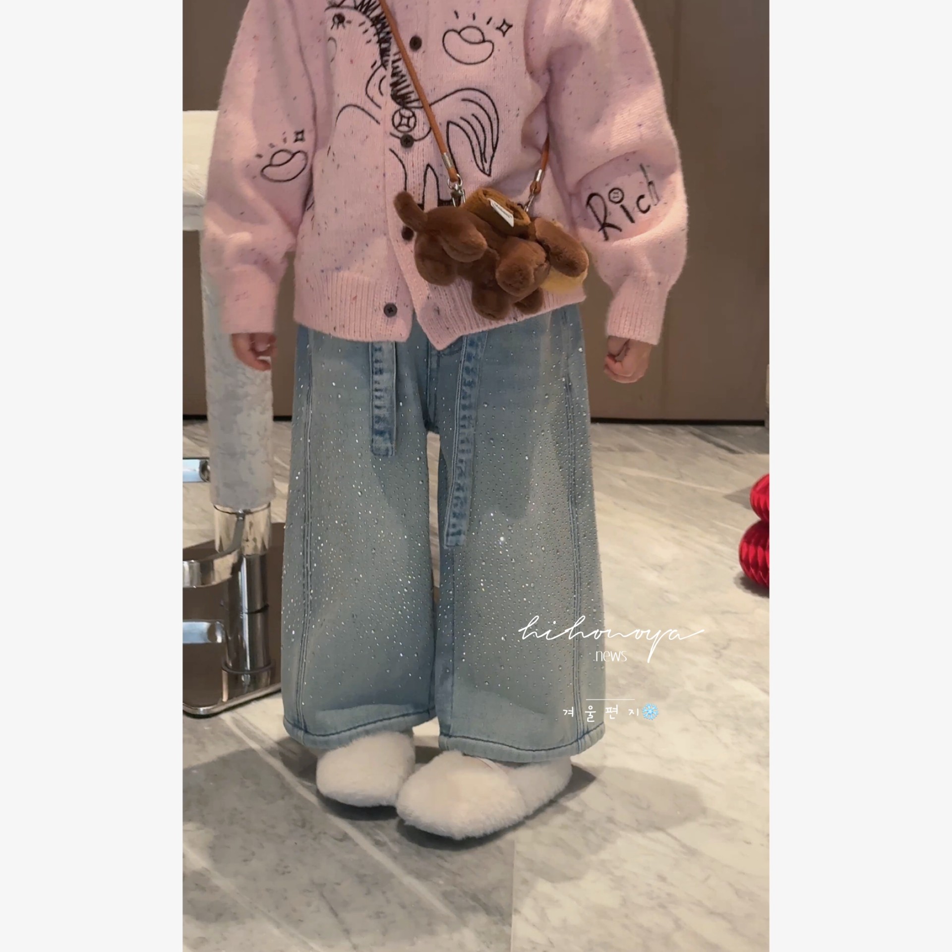 Spring韩国童装2026冬季新款亲子烫钻宽松加绒加厚牛仔裤女童裤子