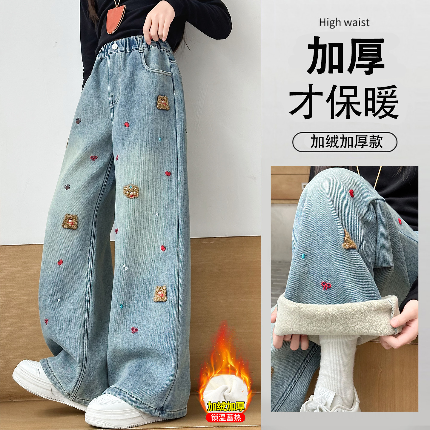 女童冬季加绒牛仔裤2025新款洋气卡通刺绣阔腿裤中大童加厚直筒裤