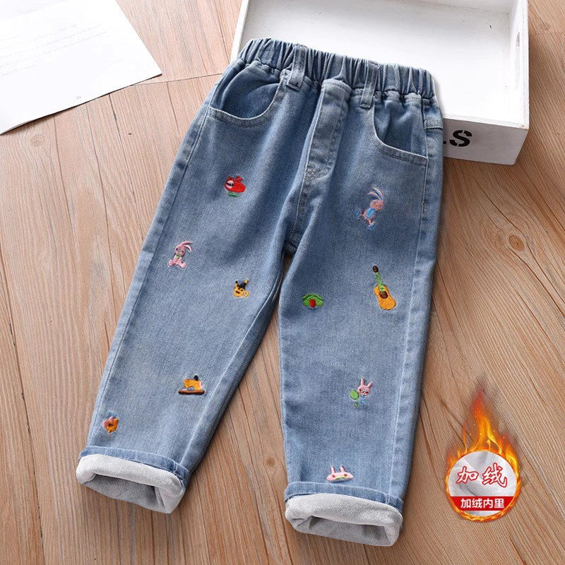 女童冬季加绒牛仔裤刺绣童装新款女孩长款加厚直筒裤儿童休闲裤子