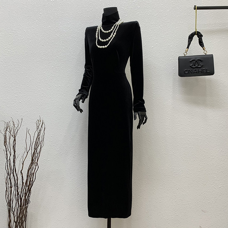 品诺狐超长款黑色长袖丝绒高领连衣裙2025秋冬新品遮肚显瘦高腰裙