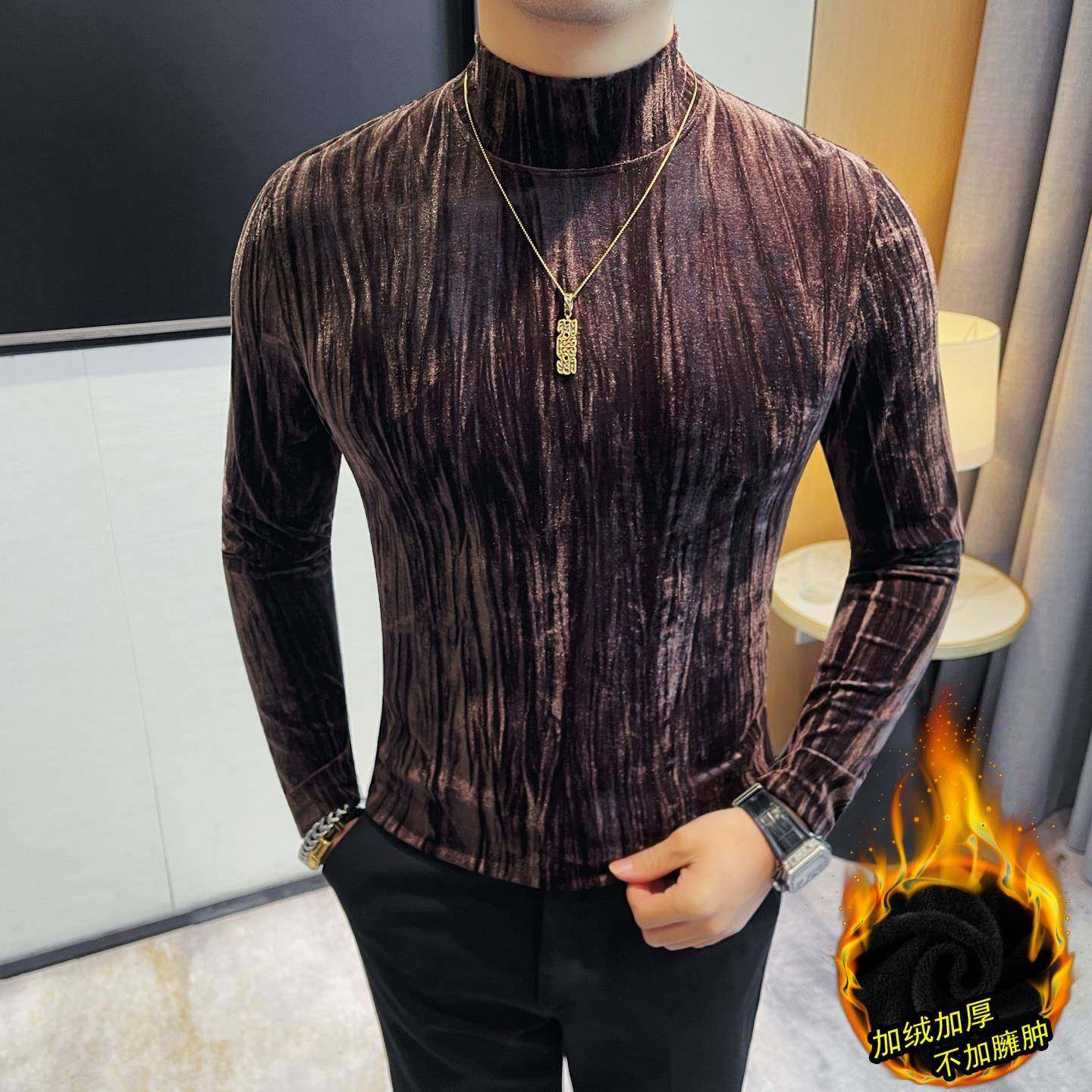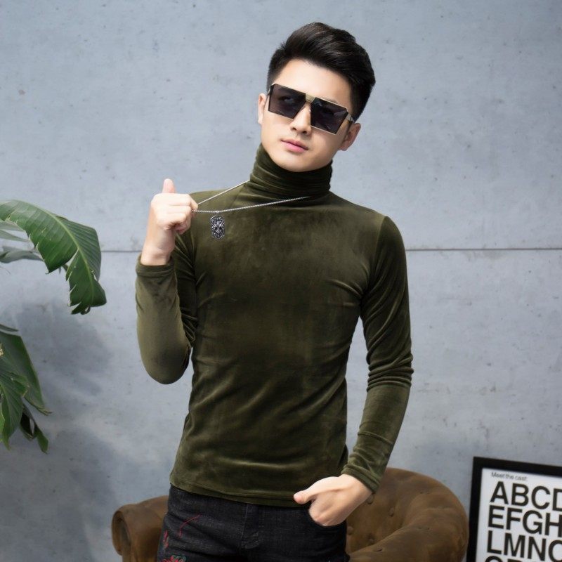 时尚秋冬丝绒高领长袖打底衫男加绒加厚保暖修身中领内搭潮1217h