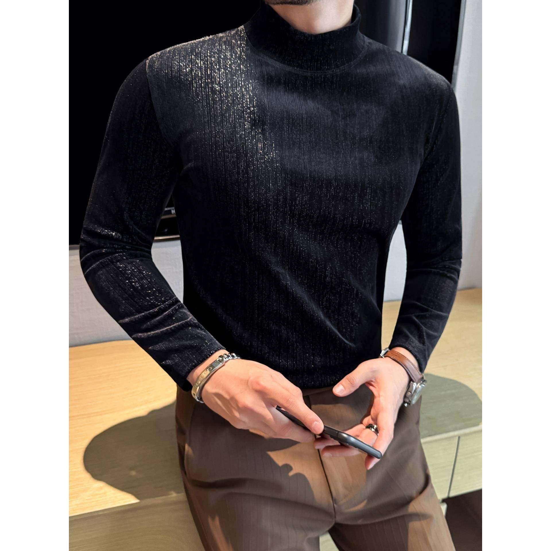 时尚秋冬丝绒高领长袖打底衫男新款时尚亮面条纹百搭修身中1217h