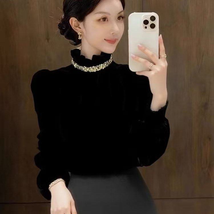 法式轻熟风黑色丝绒高领打底衫女内搭设计感修身正肩长袖上衣秋冬