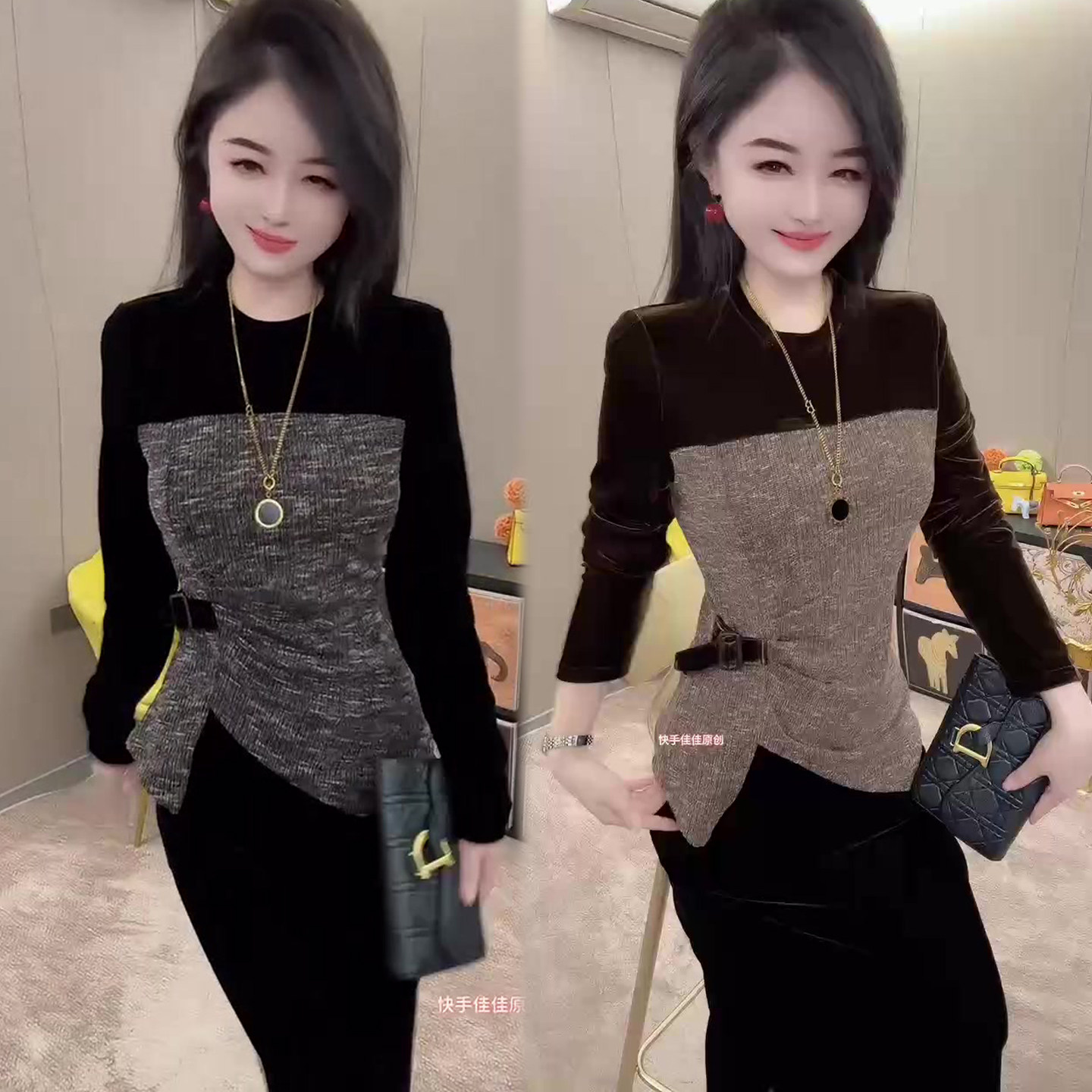 春秋金丝绒高领网纱打底衫女秋冬新款女时髦时尚气质T恤上衣小衫