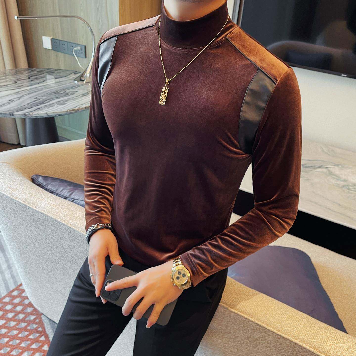 时尚秋冬丝绒高领长袖打底衫男拼接时尚修身潮流中领T恤1217h