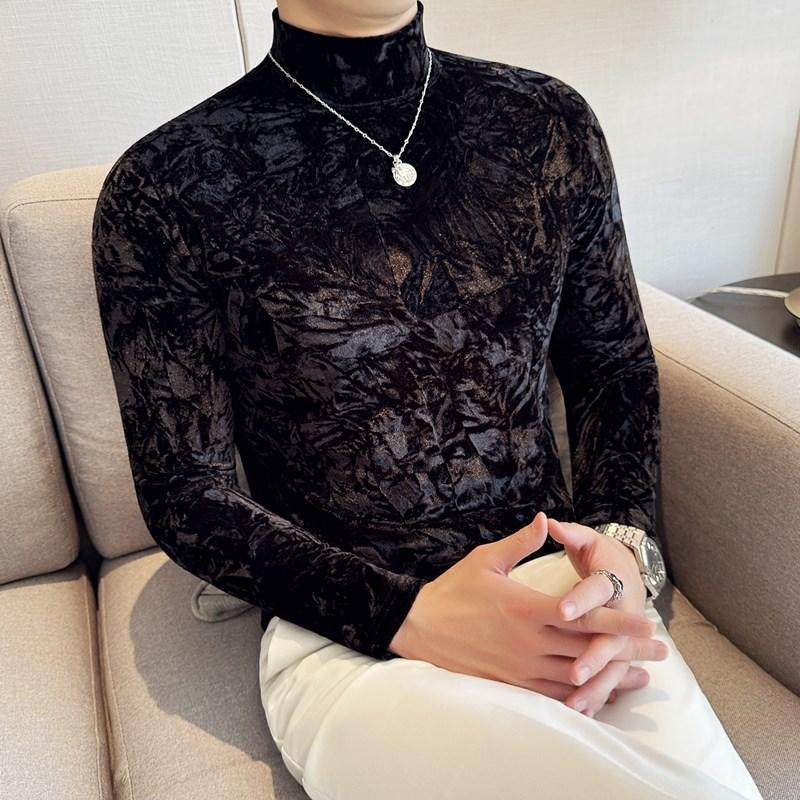时尚秋冬男士丝绒高领T恤时尚褶皱修身弹休闲中领长袖打底衫1217h