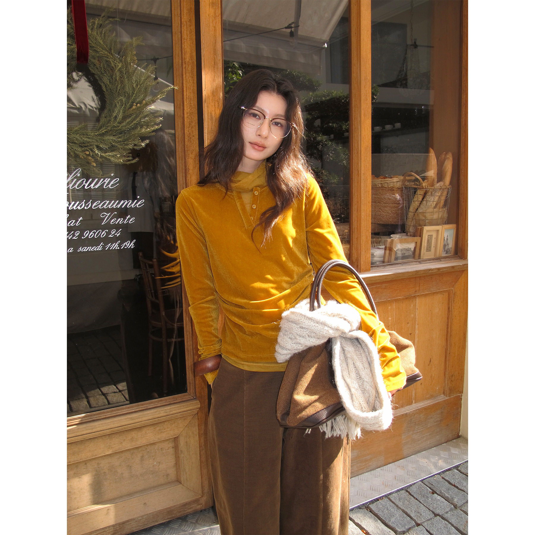 NEIHE内赫丝绒高领抽皱设计感T恤打底衫女秋冬内搭外穿假两件上衣
