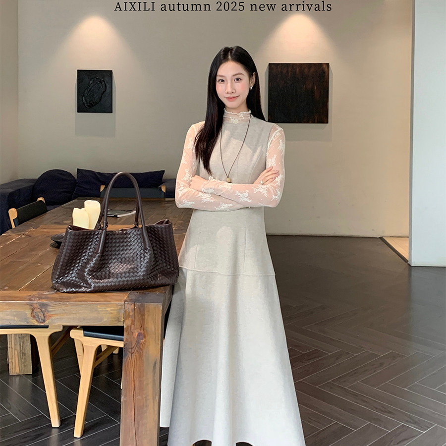 颜域高级感毛呢背心连衣裙女2025冬季新款收腰显瘦花边长款打底裙