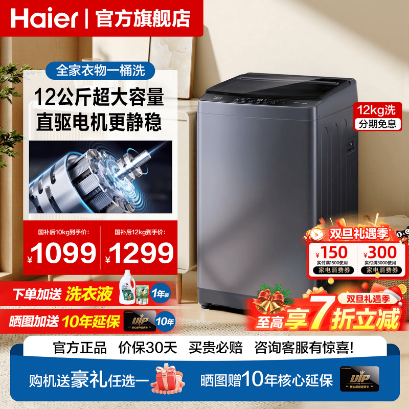 [国补省20%]海尔洗衣机10/12公斤大容量家用全自动波轮变频旗舰店