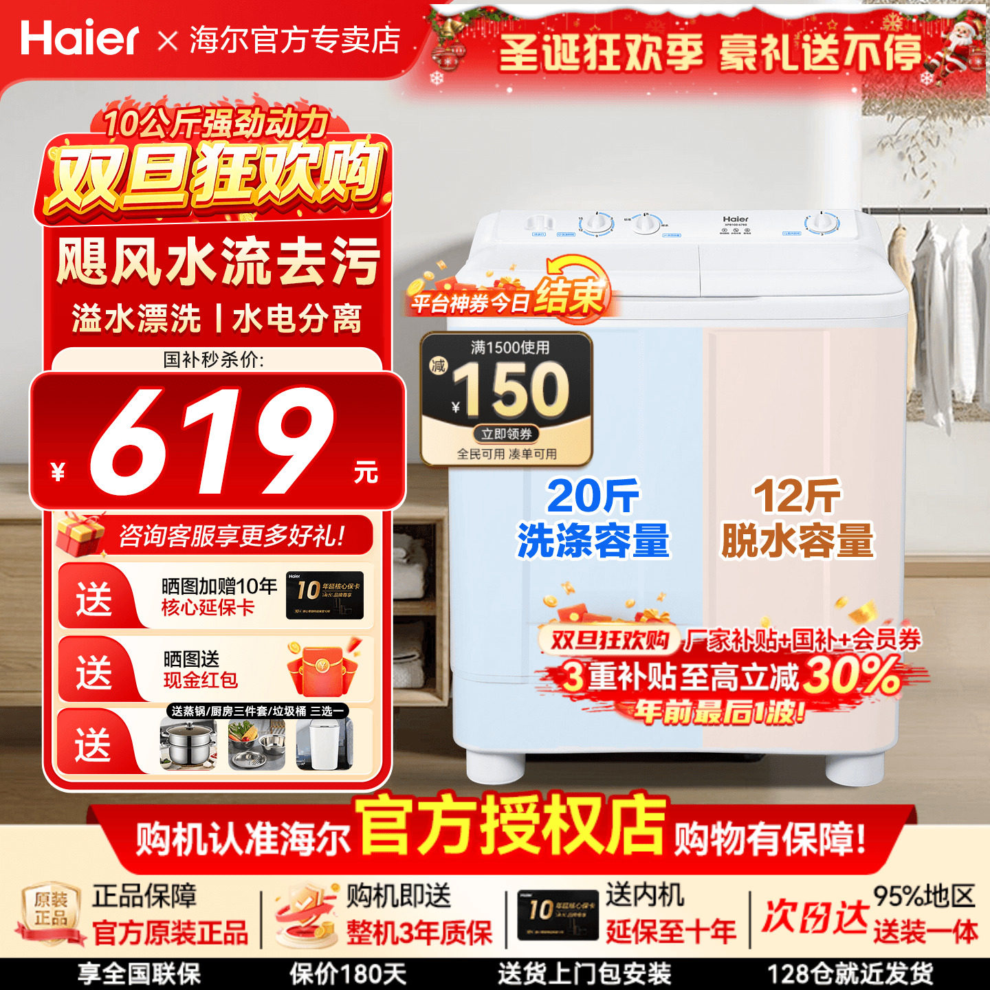 国补20%]海尔洗衣机波轮10/12公斤大容量家用全自动变频20E旗舰店