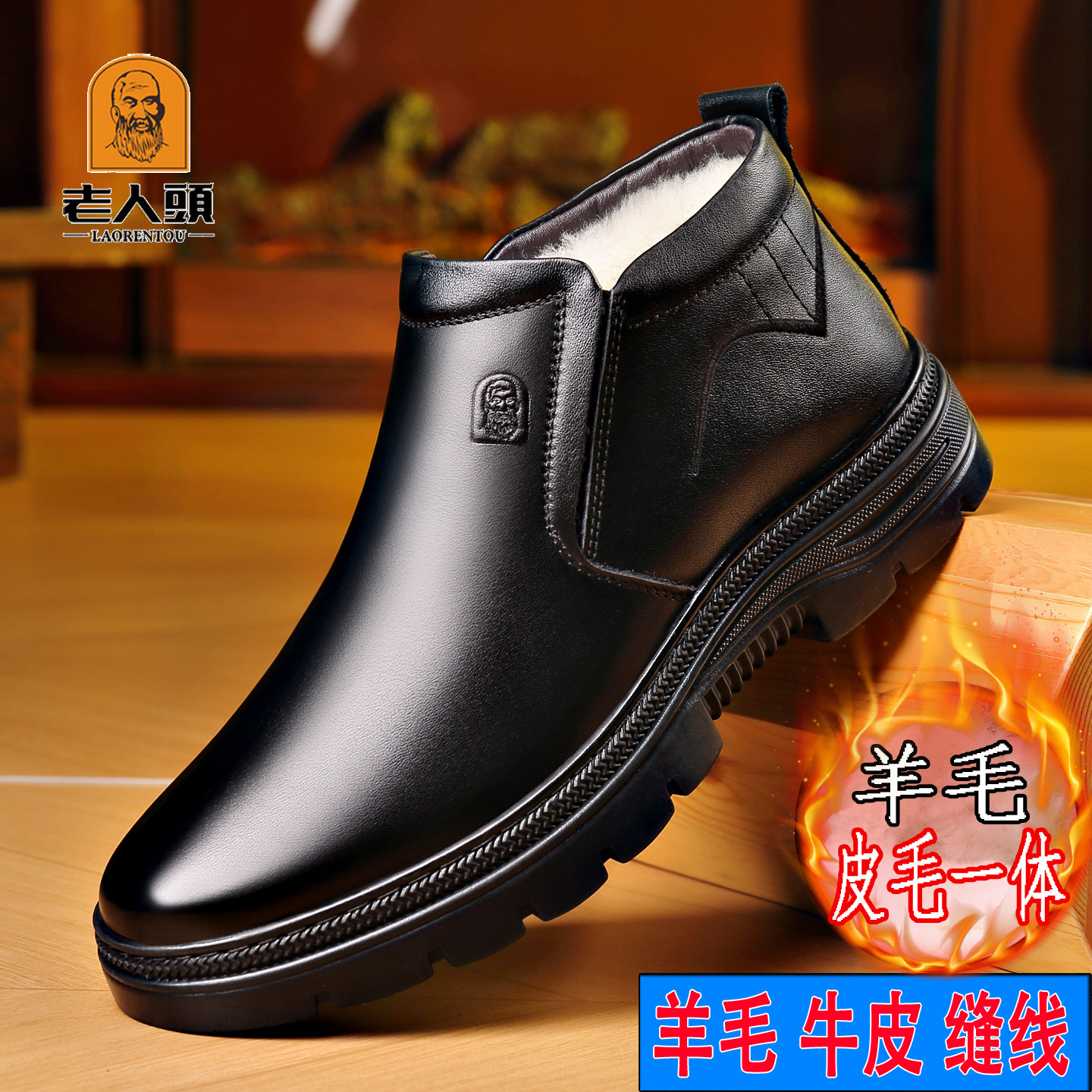 老人头皮鞋男冬季高帮棉鞋男羊毛保暖休闲鞋真皮中老年爸爸鞋加绒