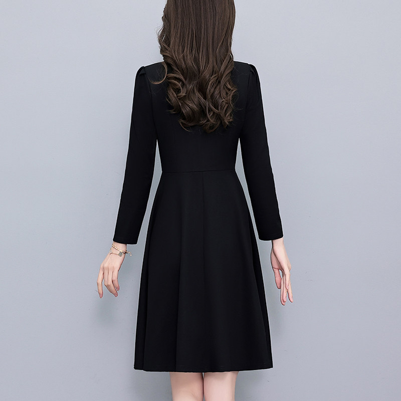 2025春秋新款淑女气质修身A字长袖小黑裙立领中裙打底黑色连衣裙