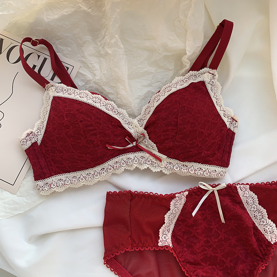 红色内衣内裤套装女本命年薄款小胸无钢圈性感蕾丝法式三角杯文胸
