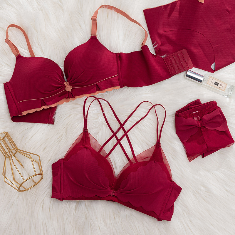 红色本命年内衣内裤套装女性感蕾丝小胸聚拢无钢圈美背前扣式文胸