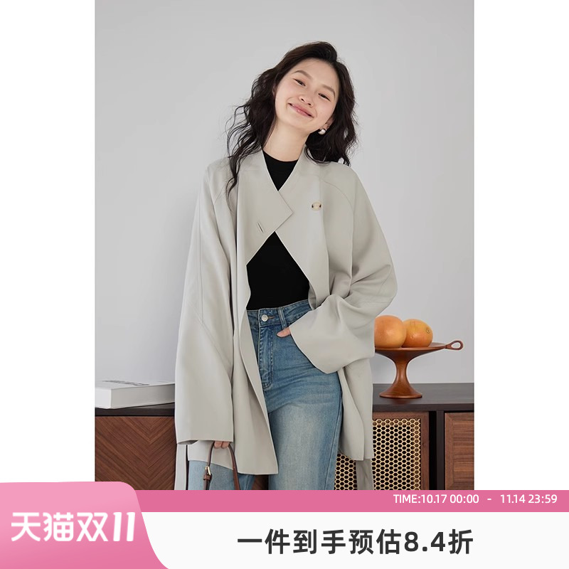 嘉茱莉2025春季新款翻领廓型风衣外套女小个子中长款风衣宽松休闲