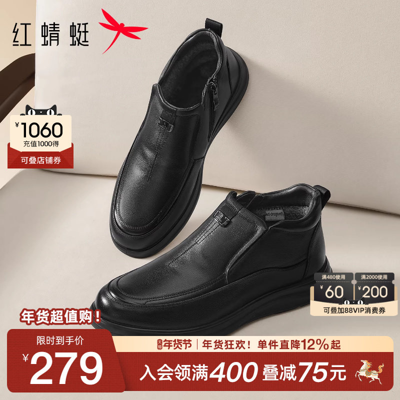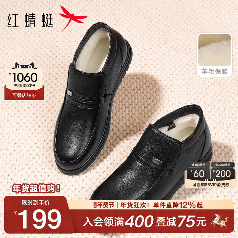 红蜻蜓男士皮鞋冬季新款加绒保暖休闲男鞋真皮中老年棉鞋爸爸鞋子