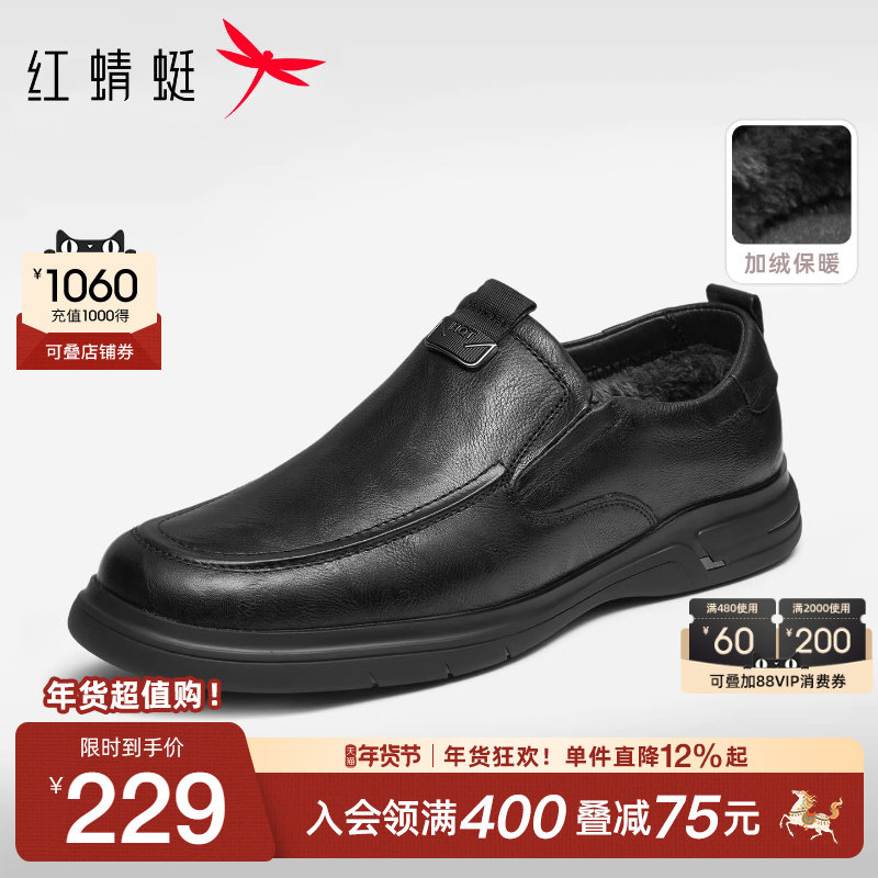红蜻蜓男士皮鞋一脚蹬大码男鞋加绒休闲中老年鞋子真皮软底爸爸鞋