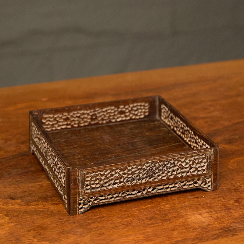 清代黄花梨透雕卷草纹方形呈盘老物件文玩古董收藏真品文房盘摆件