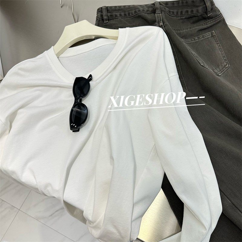 白色长袖T恤女外穿大版s宽松圆领纯棉休闲上衣叠穿秋季基础打底衫