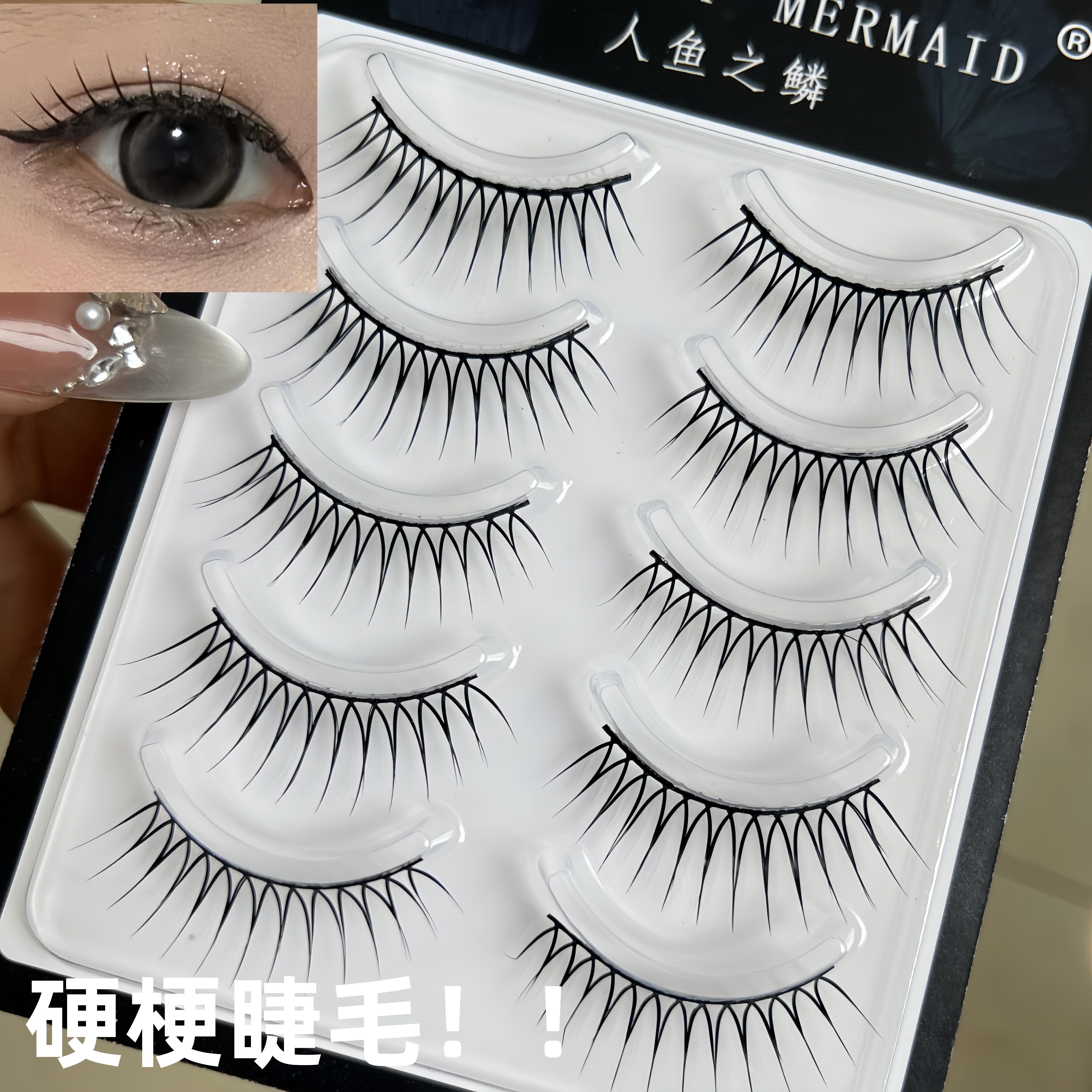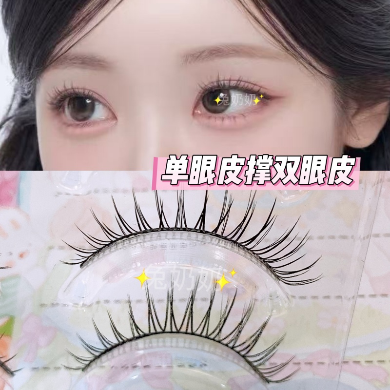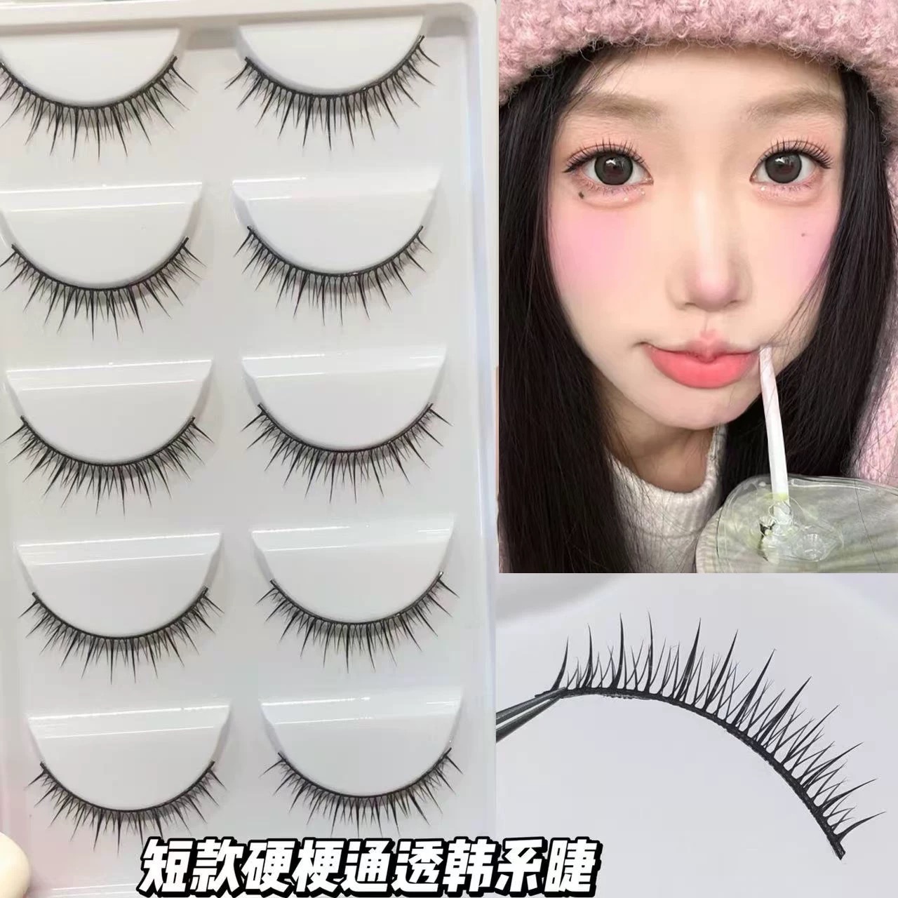 短款女团淡颜假睫毛硬梗撑双眼皮一片式自然仿真素颜韩式清透妆容