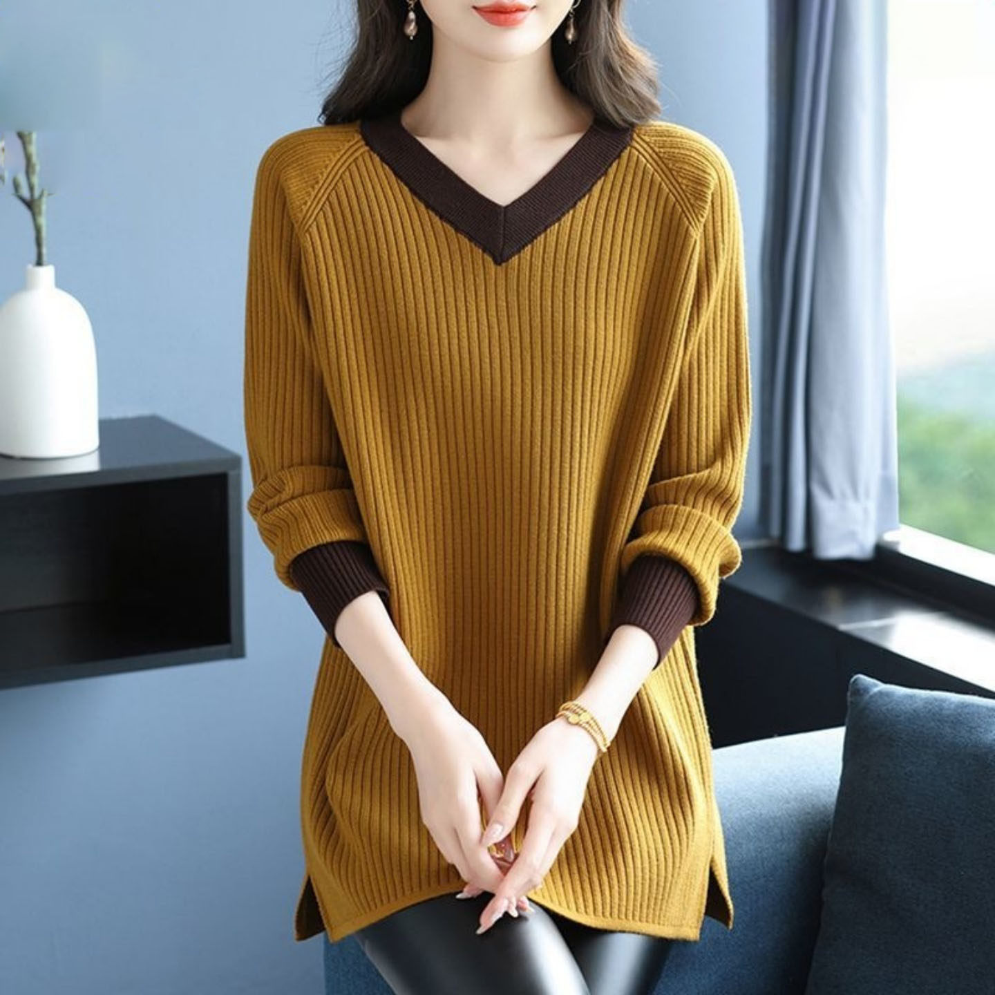 - 拼接针织衫女套头长袖