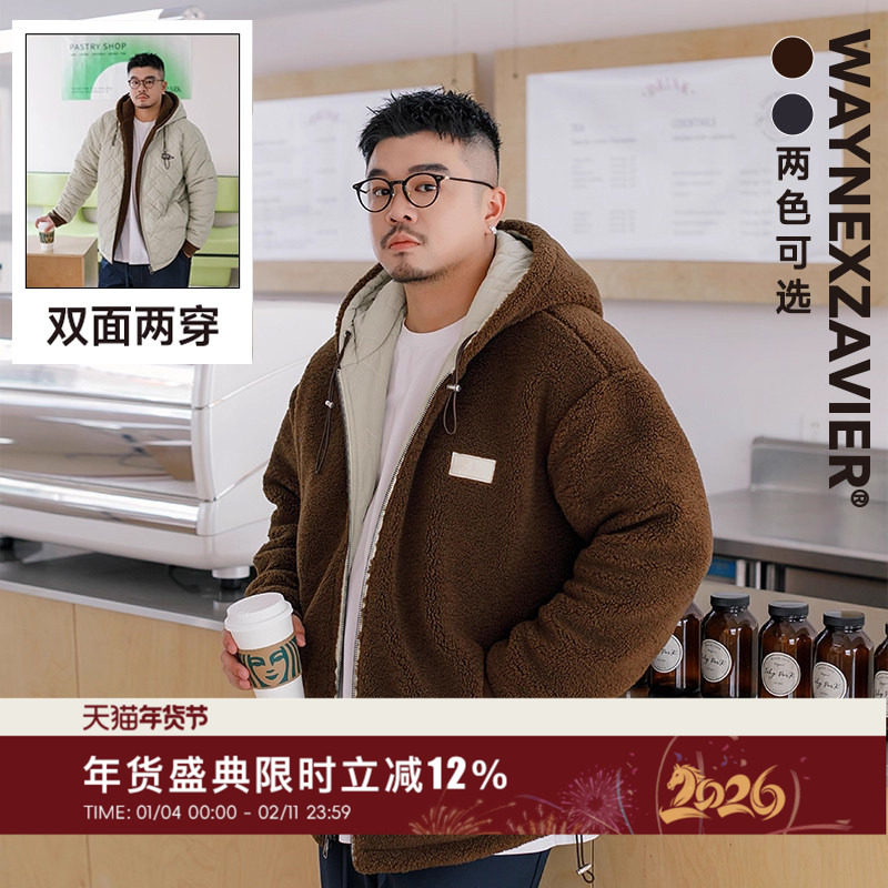 韦恩泽维尔大码双面棉服男加绒加厚宽松冬季加肥加大连帽棉衣8444