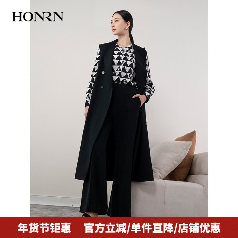 HONRN/红人气质黑色长款西装领背心马甲马夹外套女春秋HH11MJ165