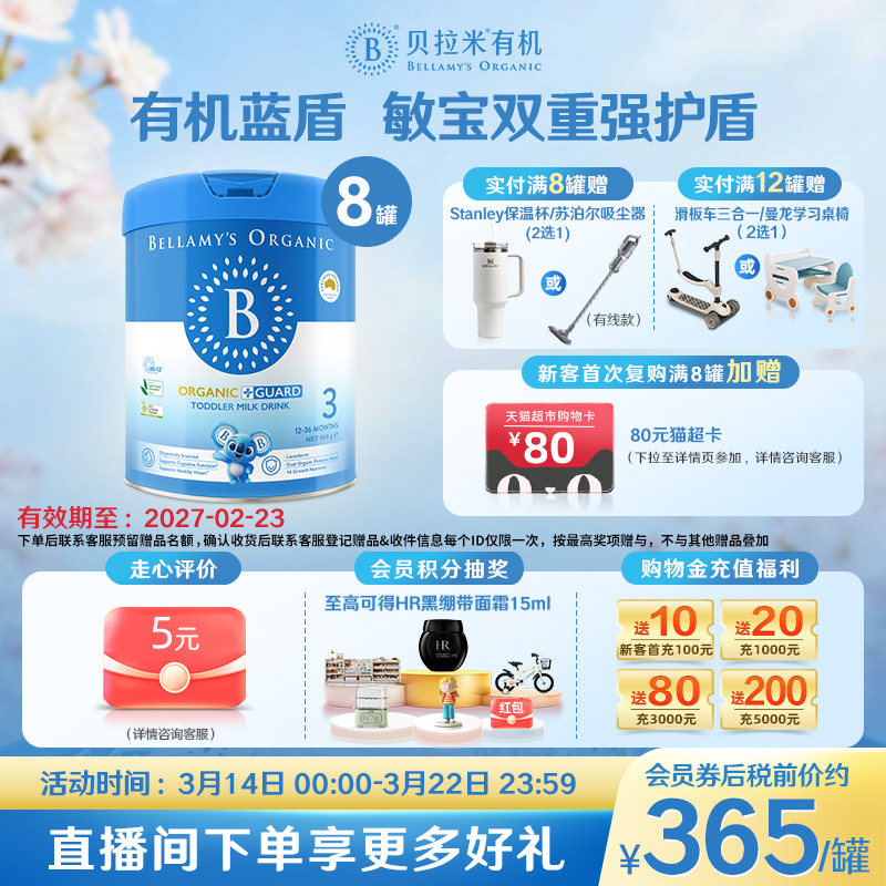 【官方正品】贝拉米白金版DHA有机A2蛋白婴幼儿奶粉3段800g*8罐装