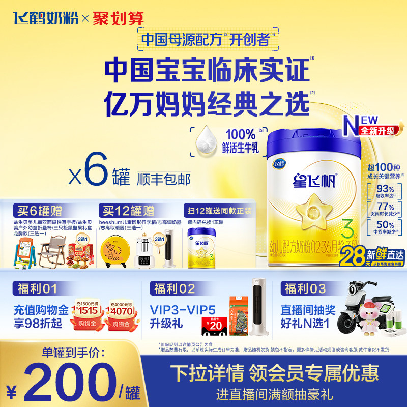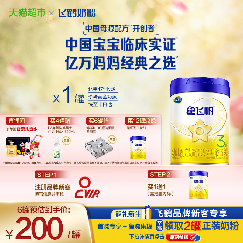 扫12送1】飞鹤星飞帆三段新生婴幼儿奶粉3段700g*6罐官方正品