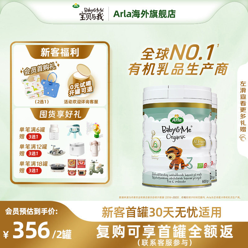 Arla宝贝与我丹麦进口有机A2白金罐婴幼儿奶粉3段600g*2罐 1-3岁