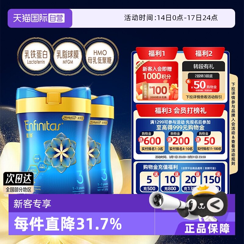 【自营】美赞臣港版蓝臻婴幼儿奶粉3段820g*2罐荷兰0蔗糖进口宝宝