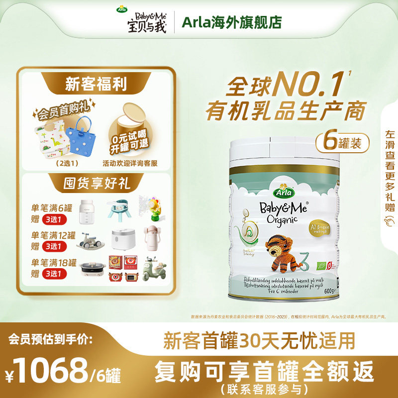 Arla宝贝与我丹麦进口有机A2白金罐婴幼儿奶粉3段600g*6罐 1-3岁