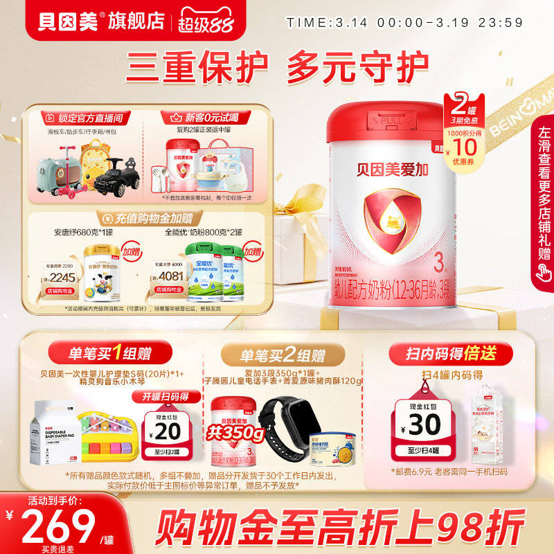 贝因美爱加婴幼儿奶粉3段800克*2罐1-3岁乳铁蛋白DHA新鲜生牛乳