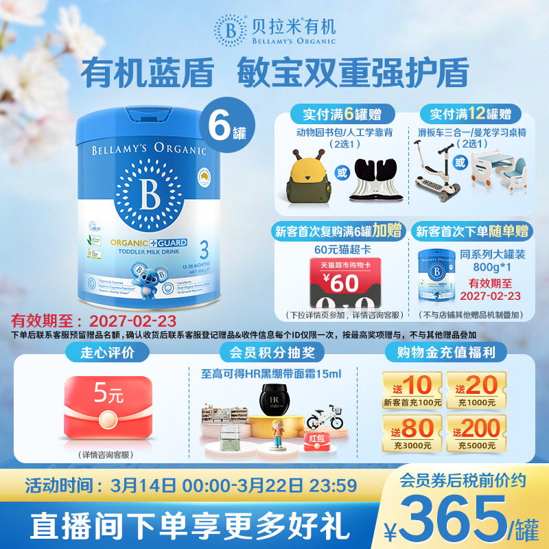 【官方正品】贝拉米白金版有机A2蛋白婴幼儿DHA奶粉3段800g*6罐
