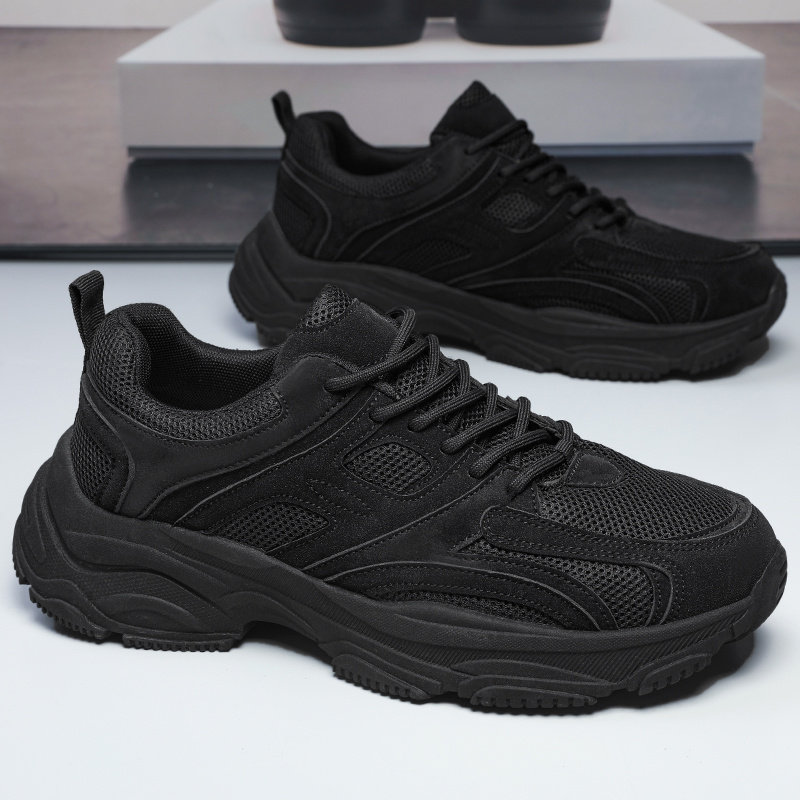 纯黑色男鞋春季网面透气运动休闲鞋上班厚底防滑劳保学生老爹潮鞋