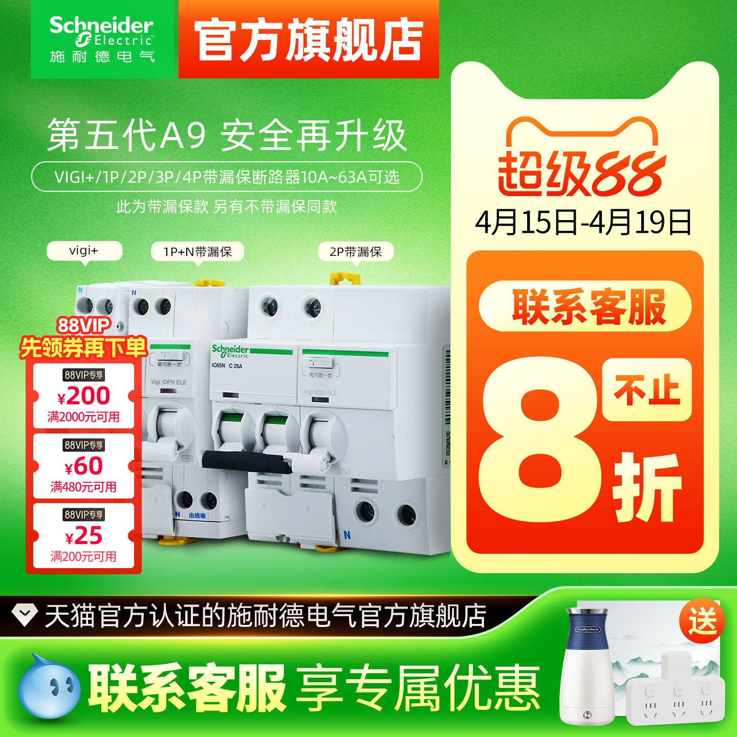 施耐德断路器D型空气开关A9动力总闸2P3P4P漏电断路器80A100A125A
